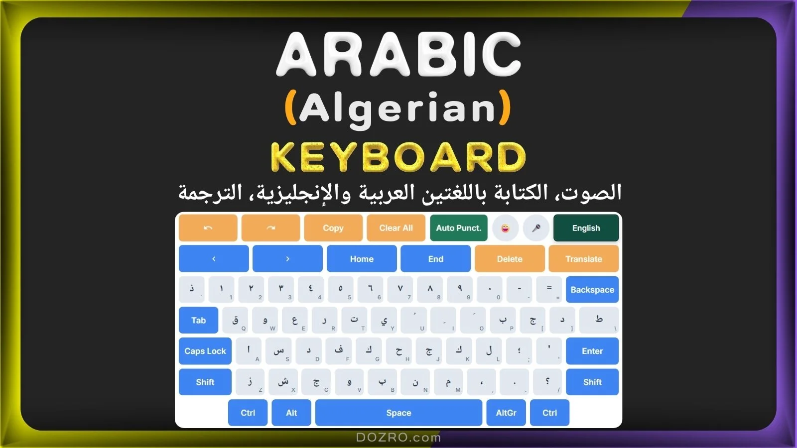 Welcome to the free Arabic (Algeria) Online Keyboard by Dozro! This intuitive on-screen keyboard is designed to help you type seamlessly in both Algerian Arabic and English, offering a familiar QWERTY phonetic layout for Arabic and essential typing features. It features voice typing (Speech-to-Text) and emoji symbols. If you're looking to type Arabic (Algerian) words using an English keyboard or write English words in Arabic, this is the ideal solution for you. This multilingual keyboard also provides translation for typed text between Arabic and English. Experience this Arabic keyboard tailored specifically for Algeria and its vibrant cities such as Algiers, Oran, Constantine, and Annaba.