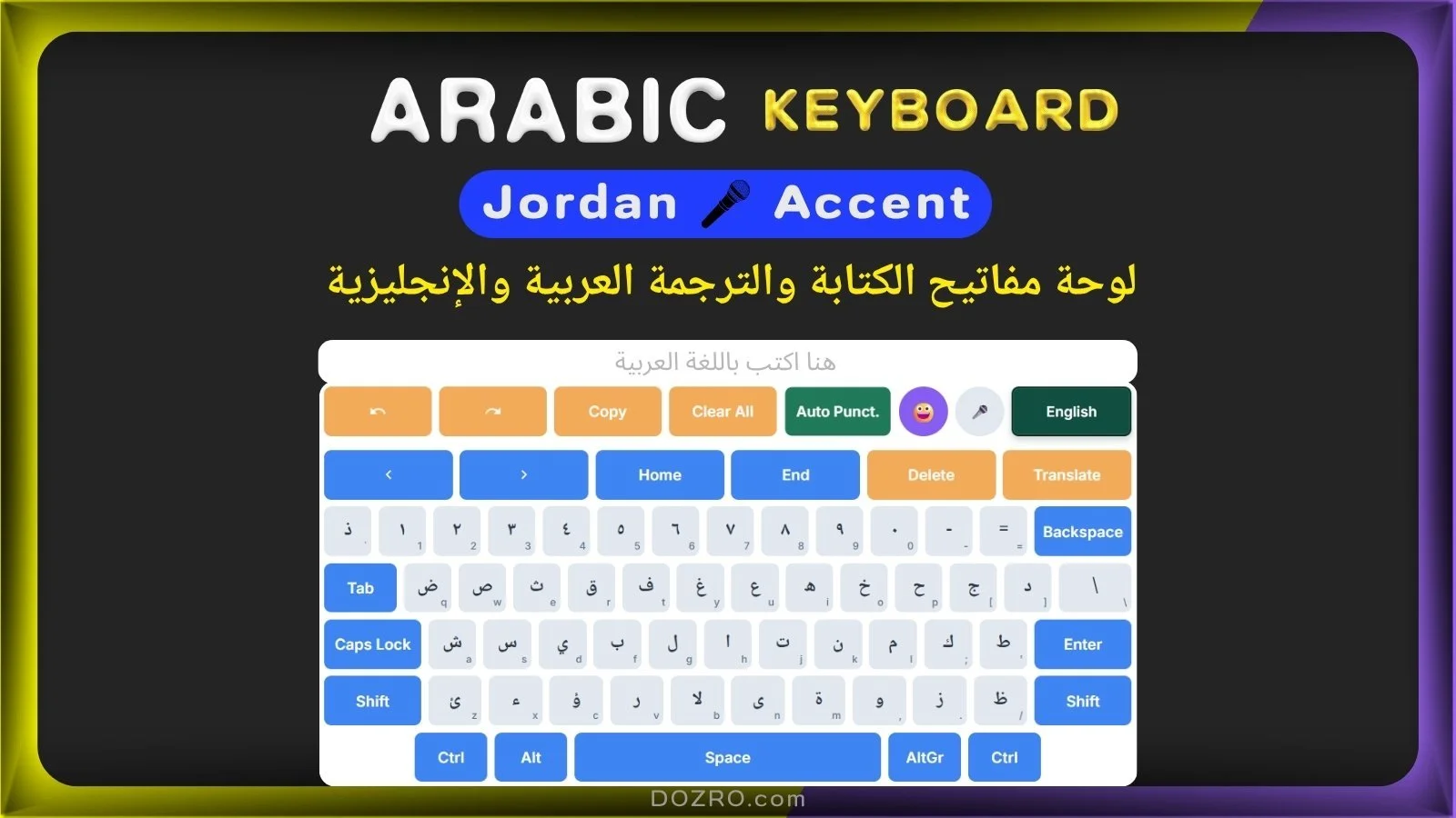 Welcome to the free Arabic (Jordanian Dialect) Online Keyboard by Dozro! This guide will walk you through all the features of our dual-language virtual keyboard, designed to make both Arabic typing and English composition simple and intuitive. This keyboard uses the standard Arabic 101 layout for a familiar and efficient typing experience. This is a complete كيبورد عربي (Arabic keyboard) solution for all your needs (لوحة المفاتيح العربية بواجهة ثنائية اللغة تسهل الكتابة باللغتين العربية والإنجليزية باستخدام تخطيط قياسي، إلى جانب ميزات الكتابة الصوتية والرموز التعبيرية، بالإضافة إلى الترجمة بين اللغتين.).