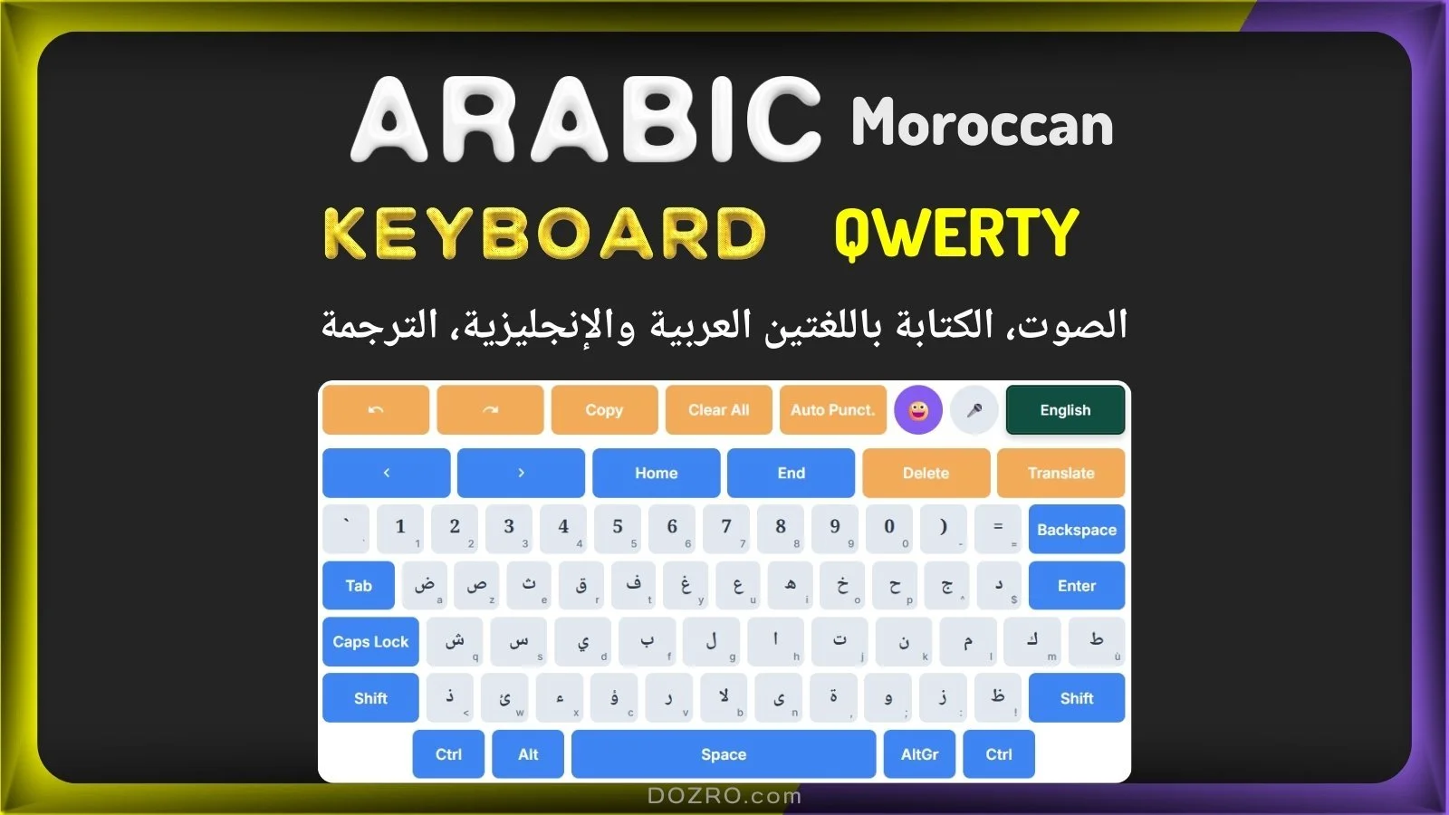 Welcome to the free Arabic (Morocco) Online Keyboard by Dozro! This intuitive on-screen keyboard is designed to help you type seamlessly in both Arabic and English, offering a familiar QWERTY phonetic layout for Arabic and essential typing features. It features voice typing (Speech-to-Text) and emoji symbols. If you're looking to type Moroccan Arabic words using an English keyboard or write English words in Arabic, this is the ideal solution for you. This multilingual keyboard also provides translation for typed text between Arabic and English. Experience this Arabic keyboard tailored specifically for Morocco and its vibrant cities such as Casablanca, Rabat, Fes, and Marrakesh.