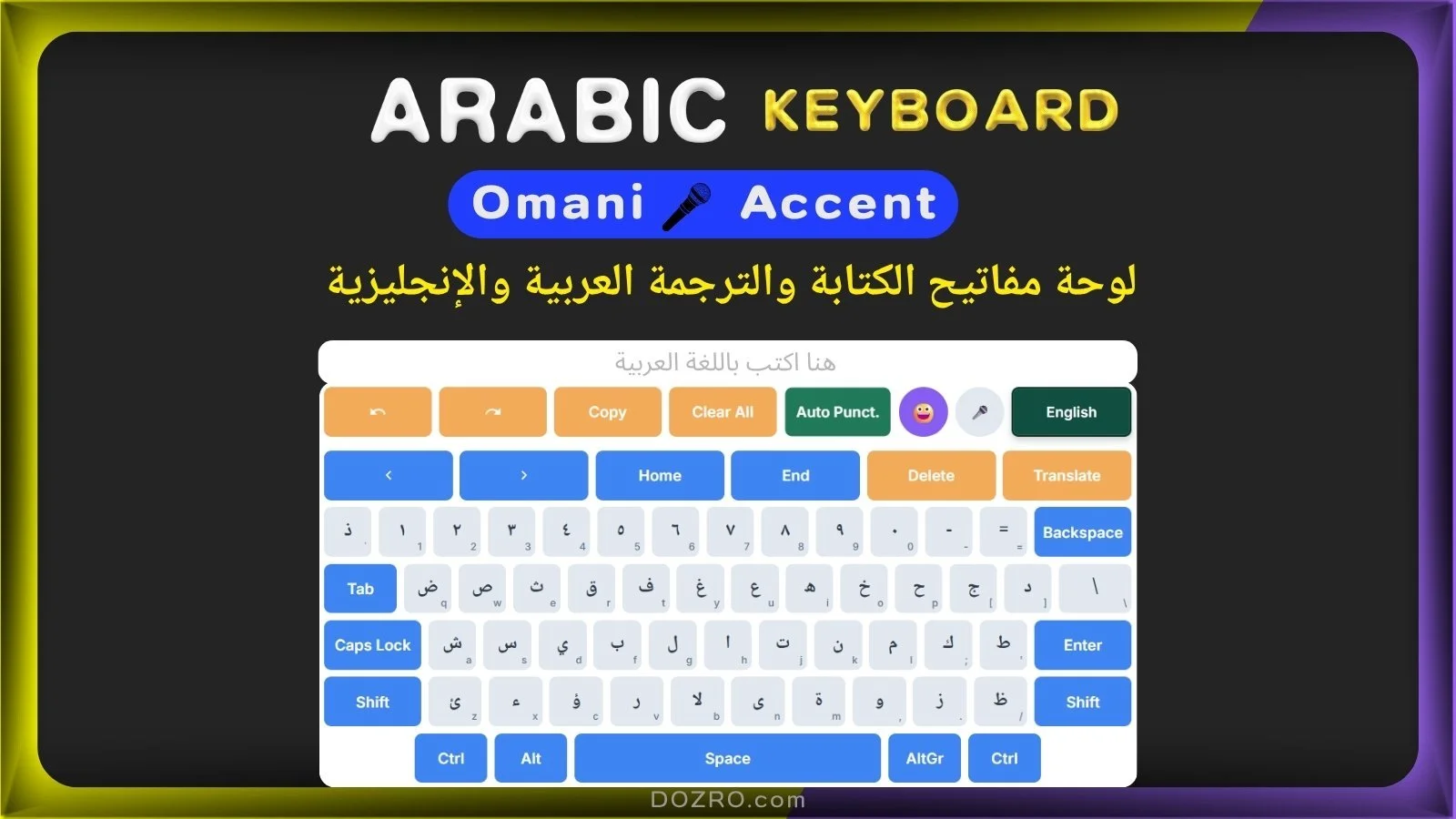Welcome to the free Arabic (Omani Dialect) Online Keyboard by Dozro! This guide will walk you through all the features of our dual-language virtual keyboard, designed to make both Arabic typing and English composition simple and intuitive. This keyboard uses the standard Arabic 101 layout for a familiar and efficient typing experience. This is a complete كيبورد عربي (Arabic keyboard) solution for all your needs (لوحة المفاتيح العربية بواجهة ثنائية اللغة تسهل الكتابة باللغتين العربية والإنجليزية باستخدام تخطيط قياسي، إلى جانب ميزات الكتابة الصوتية والرموز التعبيرية، بالإضافة إلى الترجمة بين اللغتين.).