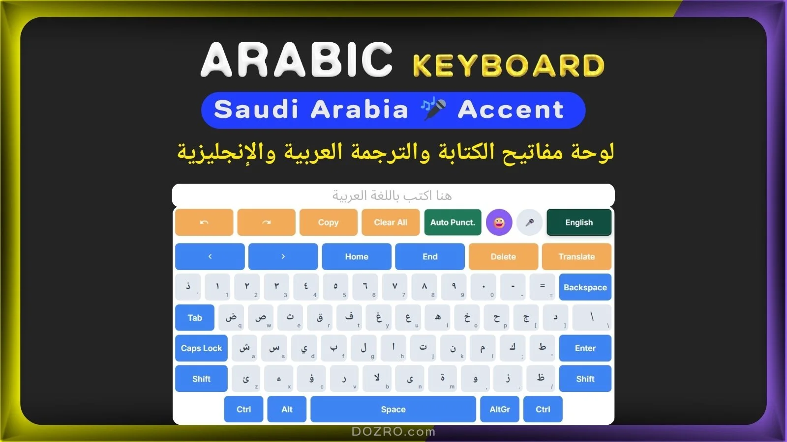 Welcome to the free Arabic Online Keyboard by Dozro! This guide will walk you through all the features of our dual-language virtual keyboard, designed to make both Arabic typing and English composition simple and intuitive. This keyboard uses the standard Arabic 101 layout for a familiar and efficient typing experience. This is a complete كيبورد عربي (Arabic keyboard) solution for all your needs (لوحة المفاتيح العربية بواجهة ثنائية اللغة تسهل الكتابة باللغتين العربية والإنجليزية باستخدام تخطيط قياسي، إلى جانب ميزات الكتابة الصوتية والرموز التعبيرية، بالإضافة إلى الترجمة بين اللغتين.).