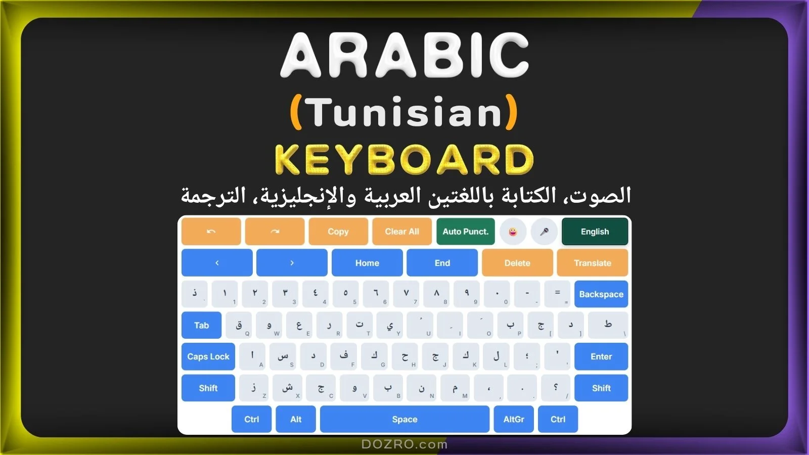 Welcome to the free Arabic (Tunisian) Online Keyboard by Dozro! This intuitive on-screen keyboard is designed to help you type seamlessly in both Arabic and English, offering a familiar QWERTY phonetic layout for Arabic and essential typing features. It features voice typing (Speech-to-Text) and emoji symbols. If you're looking to type Arabic (Tunisian) words using an English keyboard or write English words in Arabic, this is the ideal solution for you. This multilingual keyboard also provides translation for typed text between Arabic and English. Experience this Arabic keyboard tailored specifically for Tunisia and its vibrant cities such as Tunis, Sfax, Sousse, and Ettadhamen.