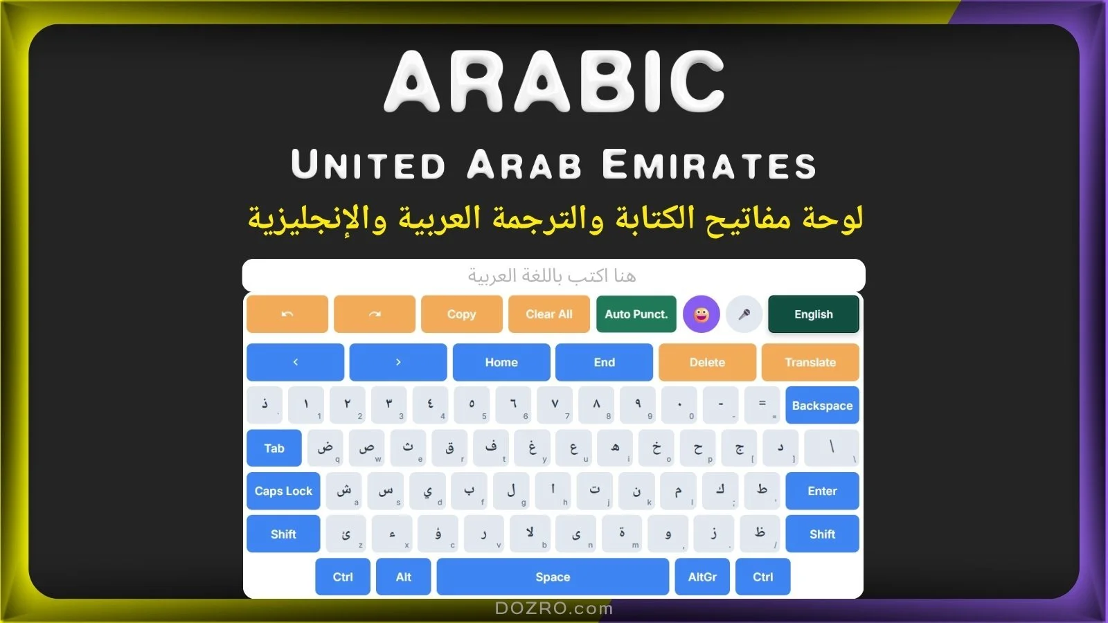 Welcome to the free Arabic (UAE Dialect) Online Keyboard by Dozro! This guide will walk you through all the features of our dual-language virtual keyboard, designed to make both Arabic typing and English composition simple and intuitive. This keyboard uses the standard Arabic 101 layout for a familiar and efficient typing experience. This is a complete كيبورد عربي (Arabic keyboard) solution for all your needs (لوحة المفاتيح العربية بواجهة ثنائية اللغة تسهل الكتابة باللغتين العربية والإنجليزية باستخدام تخطيط قياسي، إلى جانب ميزات الكتابة الصوتية والرموز التعبيرية، بالإضافة إلى الترجمة بين اللغتين.).