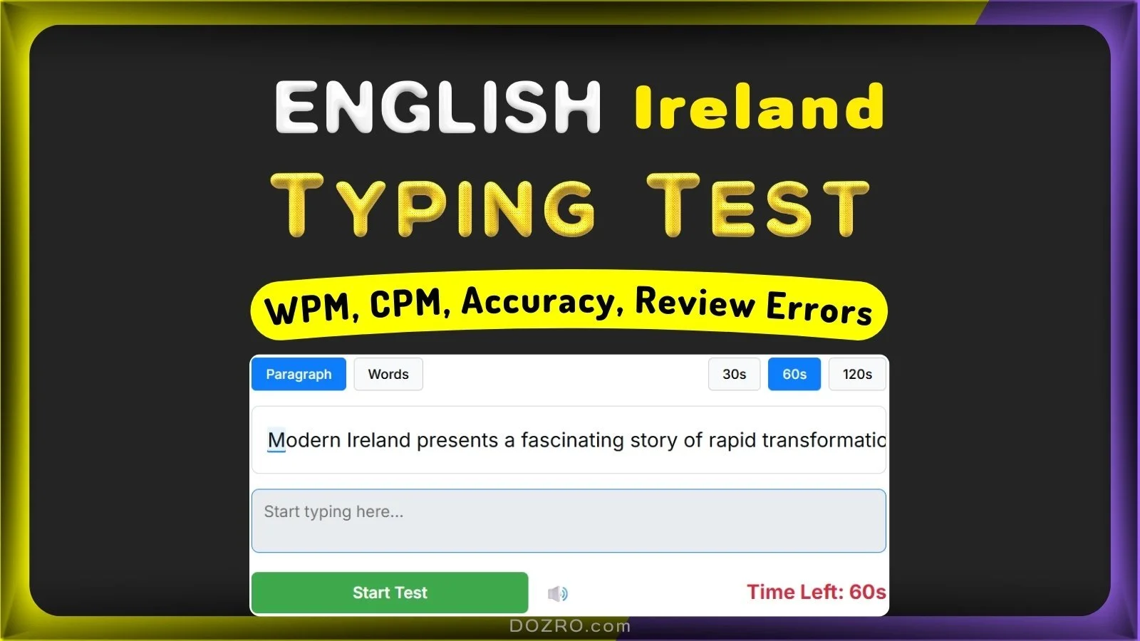 Irish English Typing Test – 30s, 60s, 120s | Track WPM Speed, Accuracy