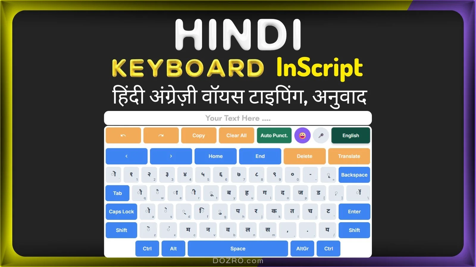 Welcome to the free Hindi InScript Online Keyboard by Dozro! This guide will walk you through all the features of our dual-language virtual keyboard, designed to make both Hindi typing and English composition simple and intuitive. This keyboard uses the standard Inscript layout, which is the official standard keyboard for typing in Hindi and other Indian languages. This is a complete हिंदी कीबोर्ड (Hindi Keyboard) solution for all your needs.