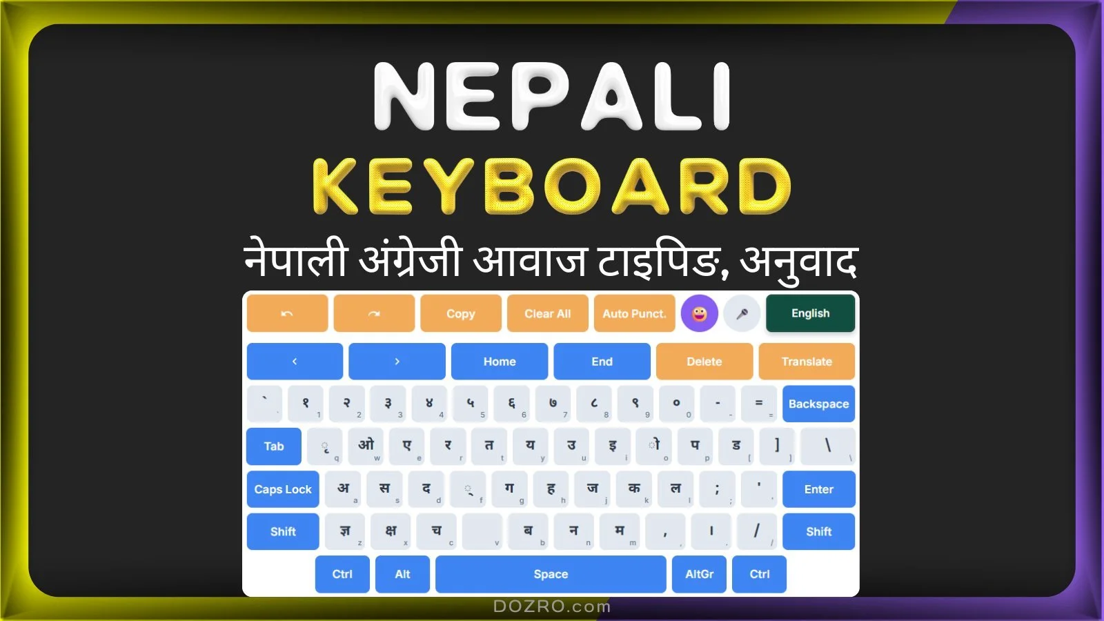 Welcome to the free Nepali Online Keyboard by Dozro! This guide will walk you through all the features of our dual-language virtual keyboard, designed to make both Nepali typing and English composition simple and intuitive. This keyboard uses a phonetic QWERTY layout, which means the Nepali keys are mapped to the sounds of their English counterparts. This is a complete नेपाली किबोर्ड (Nepali Keyboard) solution for all your needs. It features voice typing (Speech-to-Text) and emoji symbols. If you're looking to type Nepali words using an English keyboard or write English words in Gorkhali, this is the ideal solution for you. This bilingual Nepali keyboard also provides translation for typed text between Nepali and English. Nepali characters on the virtual keyboard are aligned with the English letters of the physical QWERTY keyboard, allowing you to phonetically type on the virtual keyboard using your physical keys.